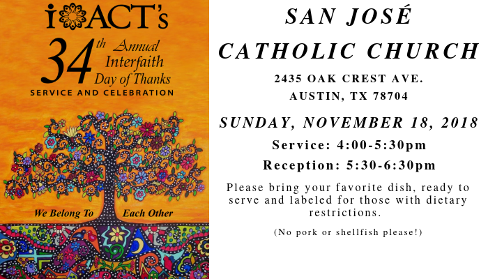 Dear Friends, We are excited to announce iACT’s 39th Annual Interfaith Day of Thanks Service and Celebration, which will take place on Sunday, November 19th at Huston-Tillotson University’s King-Seabrook Chapel (900 […]