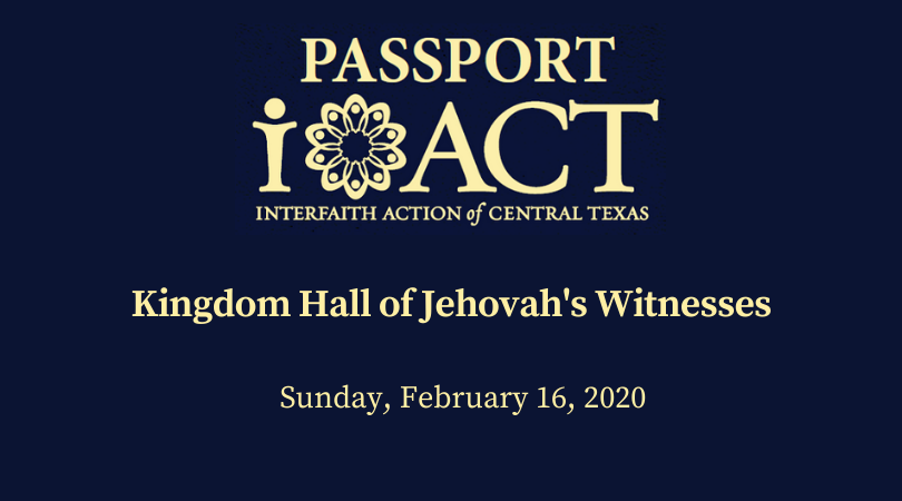 Please join the iACT Passport Program as we visit Kingdom Hall of Jehovah’s Witnesses (801 St. Elmo Rd W, Austin, TX 78745) on Sunday, February 16, 2020 at 9:00am. If you plan to attend, please RSVP here.